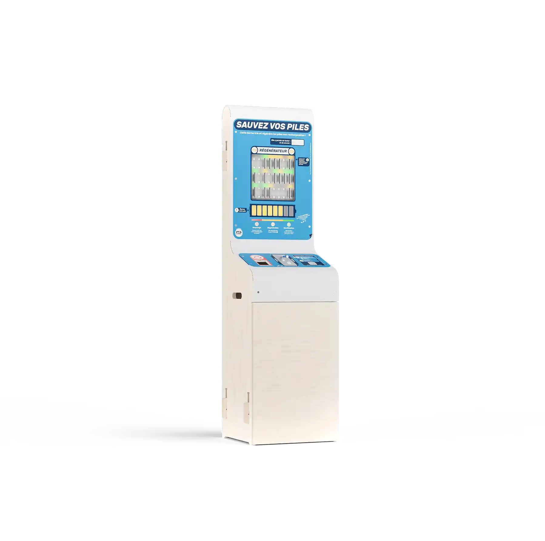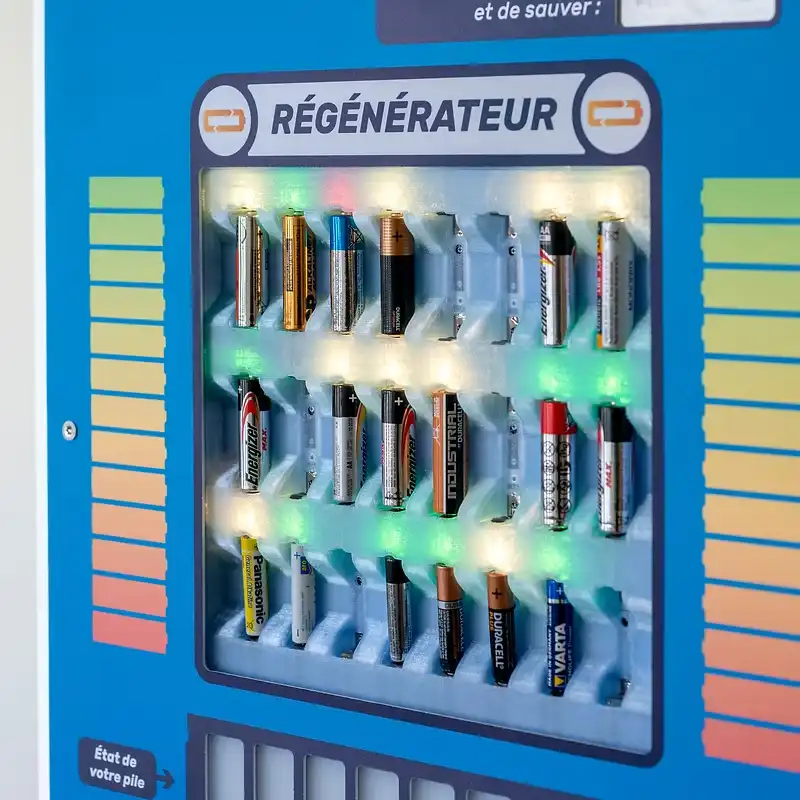 Notre borne libre-service permet de régénérer 24 piles AA ou AAA simultanément (16 piles format AA et 8 piles format AAA).